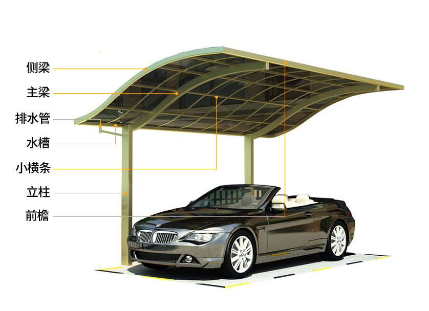 骨架材質:鈦鋁合金 頂棚材質:聚碳酸酯板 面積計算:按頂棚展開面 型材壁厚:1mm-4mm 板材厚度:2mm和3mm 尺寸:可定制 型材工藝:噴涂、電泳、轉印 框架顏色:白色、灰色、咖啡色、香檳色、木紋色 板材顏色:透明、茶色、淺灰色、深灰色、藍色 適用范圍:企業工廠、政府單位、別墅小區 款式選擇:單邊式車棚、合抱式車棚、斜拉式車棚、歐式S型車棚