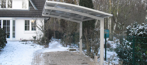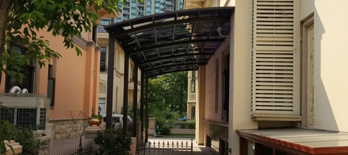 鋁合金停車棚融合歐式浪漫優美弧度,簡約時尚的設計風格,帶水槽和排水管