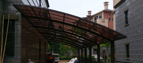 鋁合金停車棚頂棚采用進口聚碳酸酯板,抗沖擊是玻璃的數百倍,有效防止高空墜物