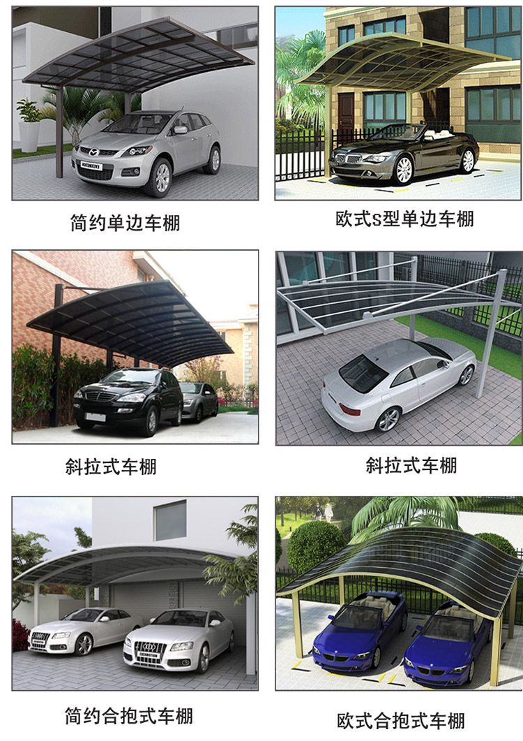 款式選擇:單邊式車棚、合抱式車棚、斜拉式車棚、歐式S型車棚
