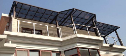 頂棚采用進口聚碳酸酯板,抗沖擊是玻璃的數百倍,有效防止高空墜物